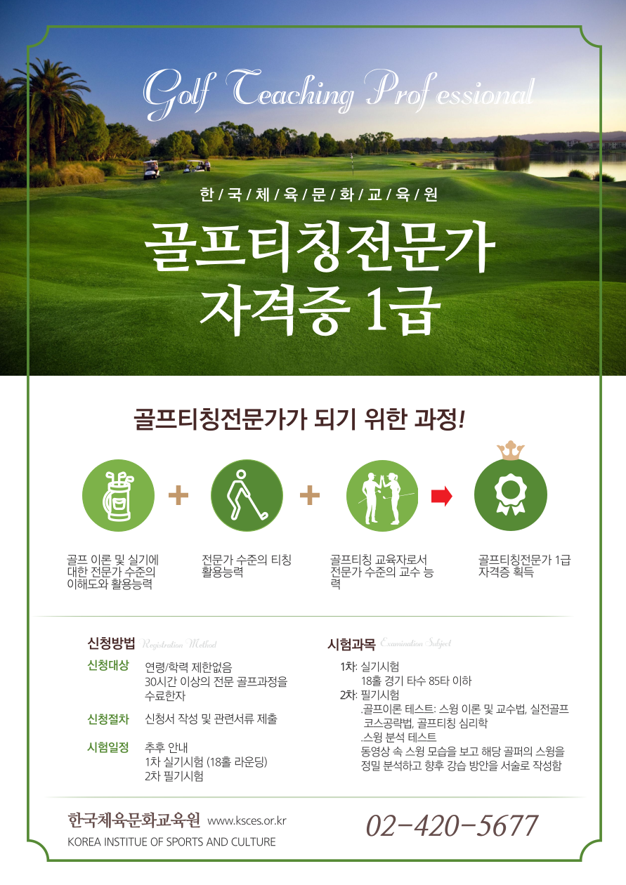 한국체육문화교육원에서는 적격자에게 한국직업능력연구원에 등록된(주무부처: 문화체육관광부) 민간자격증 "골프티칭라이센스"를 발급하고 있습니다.